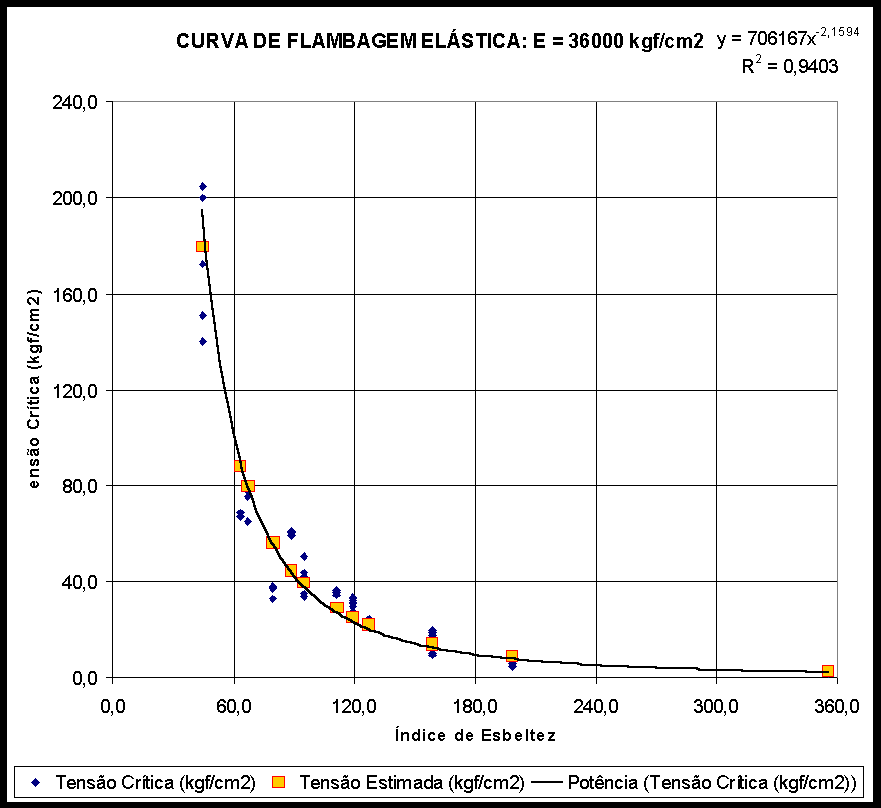 Para encontrar o número de fios necessários, consideremos que a flambagem ocorre em regime elástico linear, seguindo a equação de Euler. Os dados dos testes de flambagem foram condensados na curva de flambagem abaixo, onde os pontos em azul representam os resultados experimentais, a curva em preto um ajuste de função potência, com coeficiente de determinação de 94%, e os pontos em amarelo os resultados para diversos índices de esbeltez, considerando-se a curva de Euler com um Módulo de Young E = 36000 kgf/cm2 ou 3600 Mpa (N/mm2).